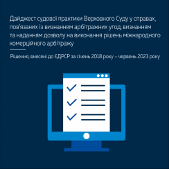 Пропонуємо до вашої уваги дайджест судової практики Верховного Суду у справах, пов’язаних із визнанням арбітражних угод, визнанням та наданням дозволу на виконання рішень міжнародного комерційного арбітражу, в інноваційному форматі – https://is.gd/PbBm3y.