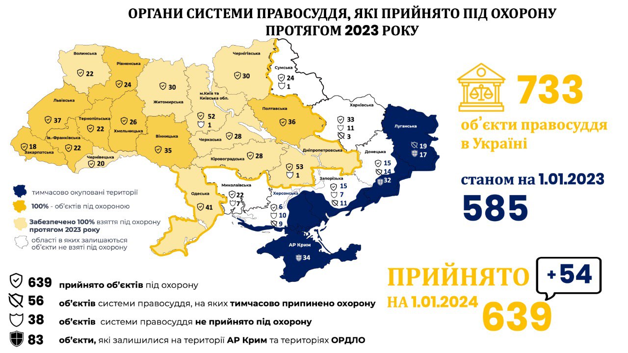 *** ПРИЙНЯТТЯ ОБ’ЄКТІВ ПІД ОХОРОНУ В умовах тривалого повномасштабного вторгнення військ російської федерації на територію України та значного ускладнення суспільно-політичної та економічної ситуації в державі Служба судової охорони залишається на варті безпеки судочинства. Продовжують вживатися заходи із забезпечення безперервності судочинства шляхом недопущення втручання у здійснення правосуддя, впливу на суди, неповаги до суду чи суддів.