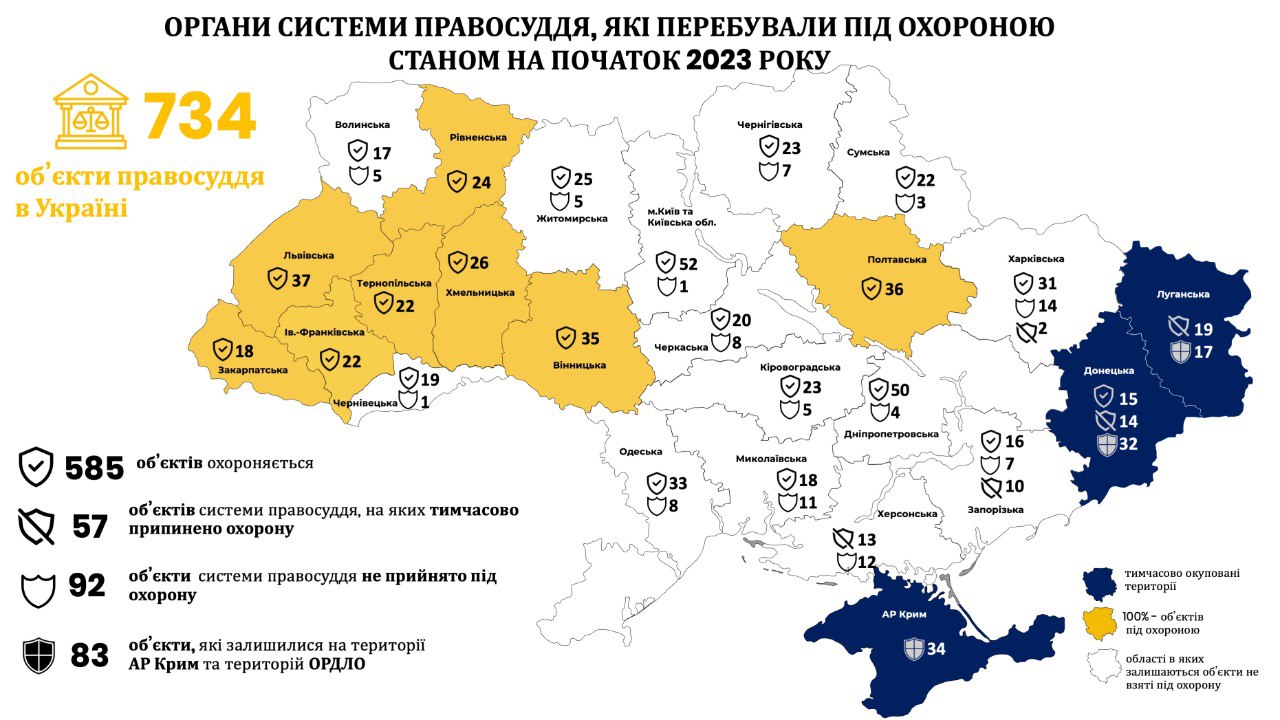 Прийняття судів під захист Служби є важливим чинником у забезпеченні недоторканності та неупередженості правосуддя. Відчуття безпеки всіх учасників судового процесу сприяє установленню справедливих та об’єктивних рішень. Впродовж 2023 року Служба судової охорони взяла під свій захист 54 суди, і, попри повномасштабне вторгнення росії, об’єкти правосуддя продовжують функціонувати на територіях, близьких до бойових дій. Отож прийняття судів під охорону Служби відіграє ключову роль для гарантування безперешкодного функціонування судової системи та захисту прав громадян на справедливе судочинство.