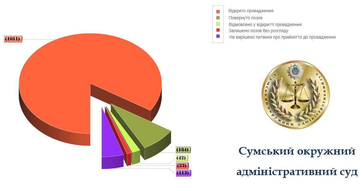 З них на кінець звітного періоду відкрито провадження по 1911 справам; повернуто - 184, відмовлено у відкритті провадження - 42, залишено без розгляду - 23. Кількість позовних заяв, щодо яких станом на кінець звітного періоду не вирішено питання про прийняття до провадження становить 113 заяв.