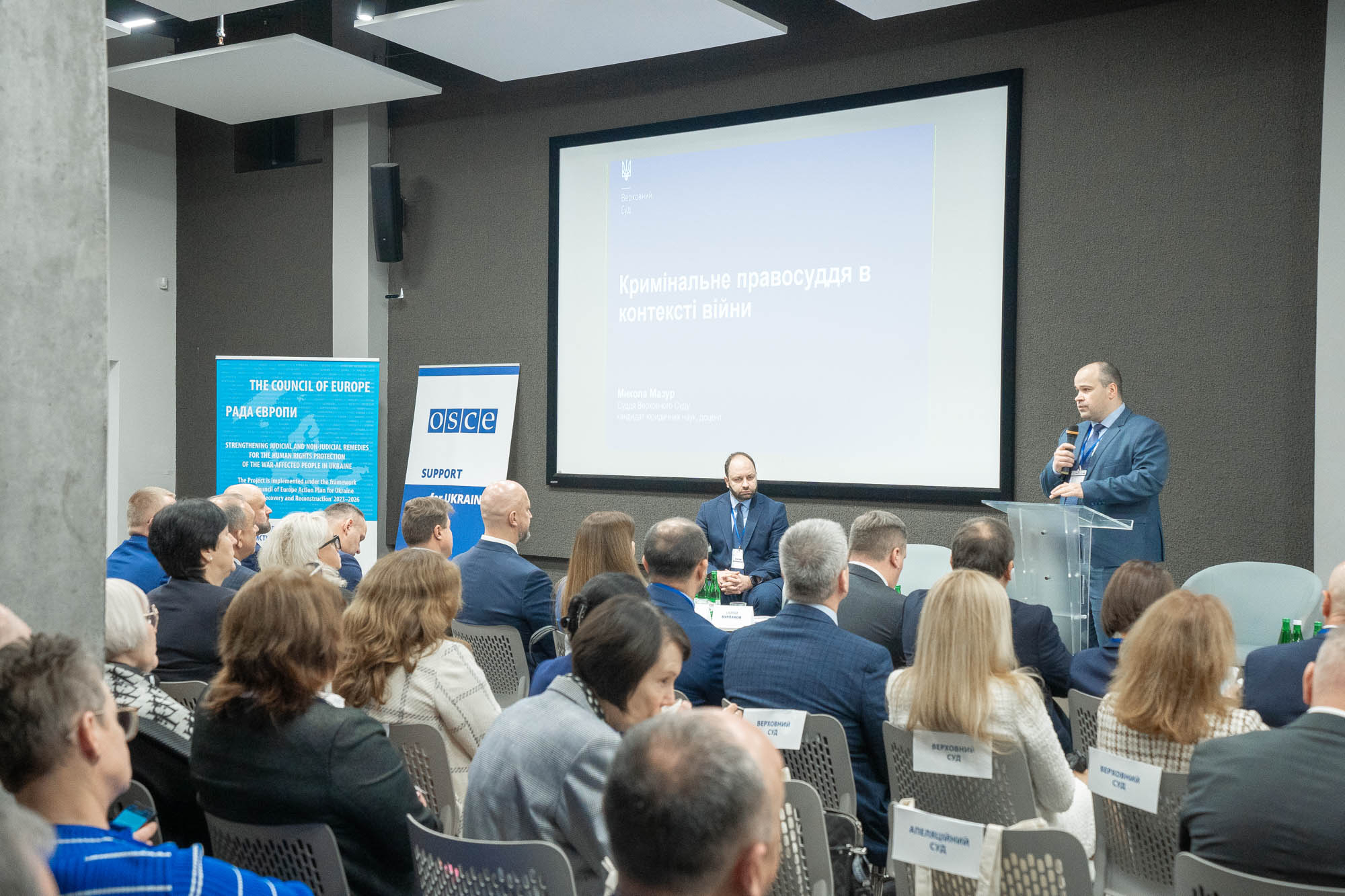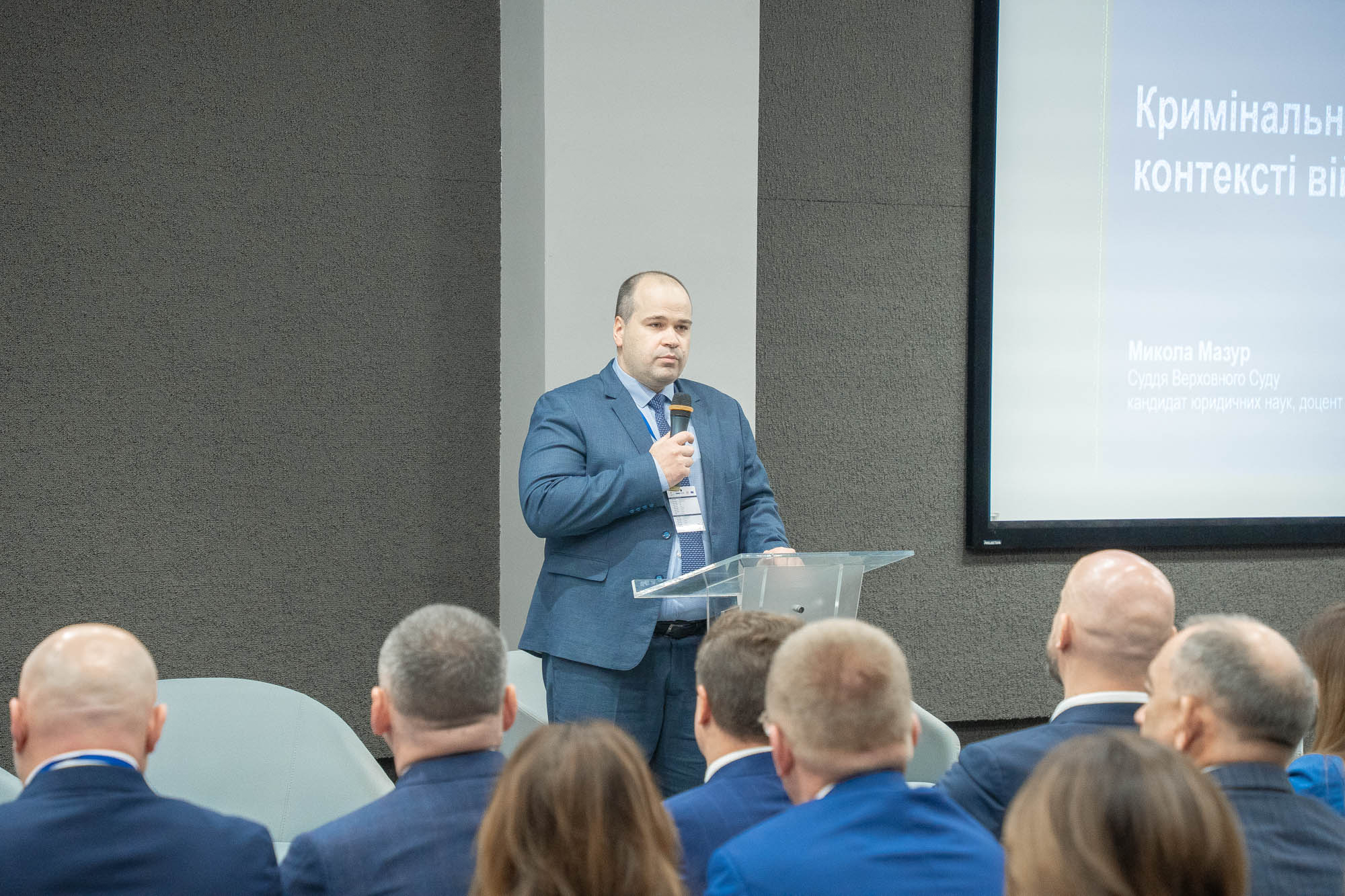 З доповіддю «Кримінальне правосуддя в контексті війни» виступив суддя Верховного Суду у Касаційному кримінальному суді Микола Мазур. Він наголосив на тому, що війна неминуче впливає на всі процеси в суспільстві, у тому числі на кримінальне судочинство. Статистика свідчить, що у 2022 році кількість кримінальних проваджень і матеріалів, які надійшли до судів, значно зменшилася, однак уже в першій половині 2023 року спостерігалася зворотна тенденція, яка свідчить про те, що суспільство в цілому та судова система адаптувалися до нових (безперечно, екстремальних) умов.