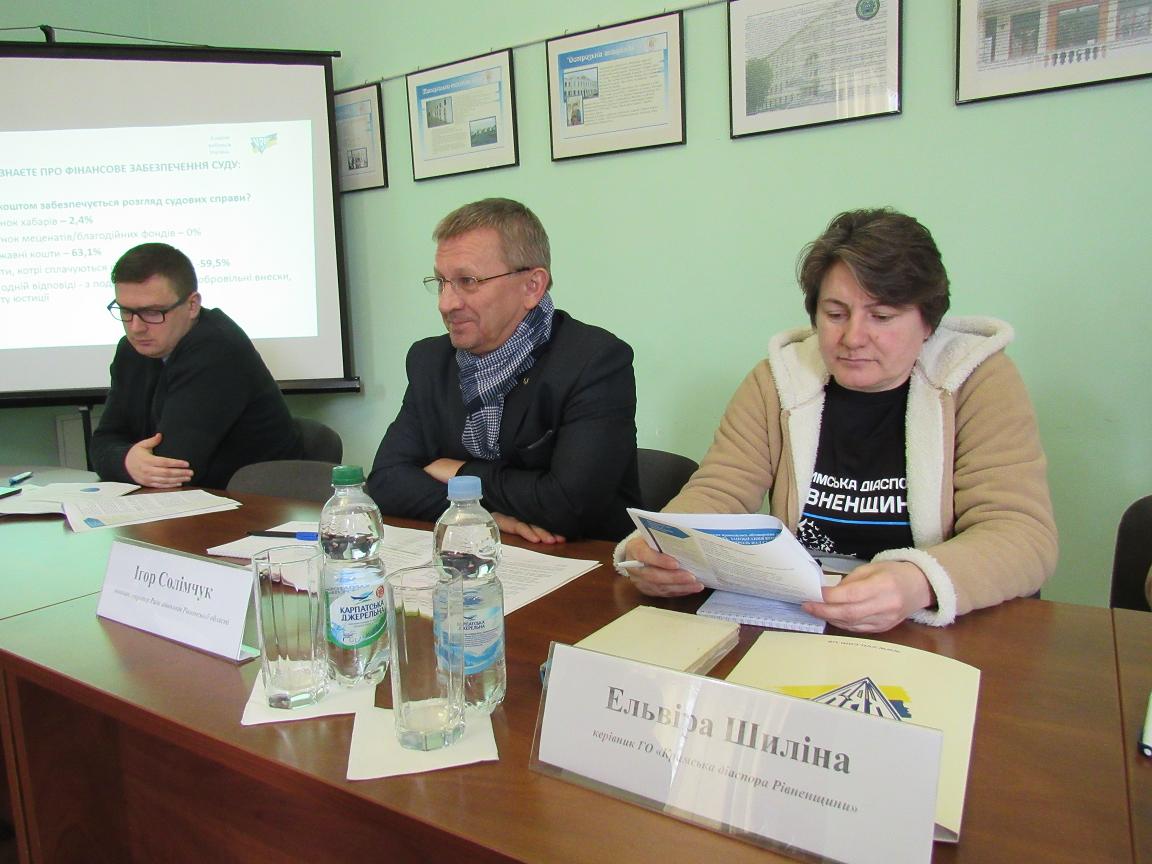 Директор Рівненської обласної громадської організації «Комітет виборців України» Олексій Горецький увагу присутніх зосередив на результатах фокус-групових досліджень, які проводились торік упродовж листопада в 14 регіонах, у тому числі й на Рівненщині. Дослідження включало в себе чотири теми, які складались із чотирьох блоків, серед яких — прозорість (мова йде про електронний суд, декларації суддів, перевірка стилю життя відповідно до рівня заробітку); запобігання корупції та доцільність недоторканості суддів, їх переатестації і нових людей судовій системі. Наступний блок — фінансове забезпечення, де аналізувались забезпечення судового розгляду, штрафи за порушення дисципліни та йшлося про заробітні плати суддів, як засобу уникнення корупційних ризиків. Завершальним етапом опитування стали інструменти обговорення контролю над суддями. Зокрема, присутні проаналізували, який орган здійснює призначення/звільнення суддів, яким чином здійснюється громадський контроль і як краще призначати суддів.