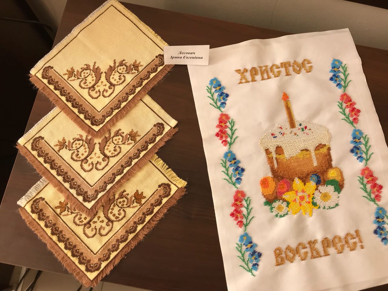 Картини та ікони представлені на виставці мають майстерне поєднання кольорів, їх плавний перехід створюють враження не вишитих робіт, а малярських творів. Дивлячись на полотна здалеку, не віриться, що виконані вони не фарбами, а нитками та бісером.
