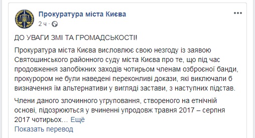 22 червня на сторінці прокуратури міста Києва у «Facebook» було висловлено незгоду із заявою Святошинського районного суду міста Києва.