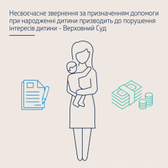 Допомога при народженні дитини за своєю природою є допомогою самій дитині, а не її батькам. Неможливість своєчасного звернення одним з батьків до органу, який здійснює призначення допомоги при народженні дитини, призводить до порушення інтересів дитини.