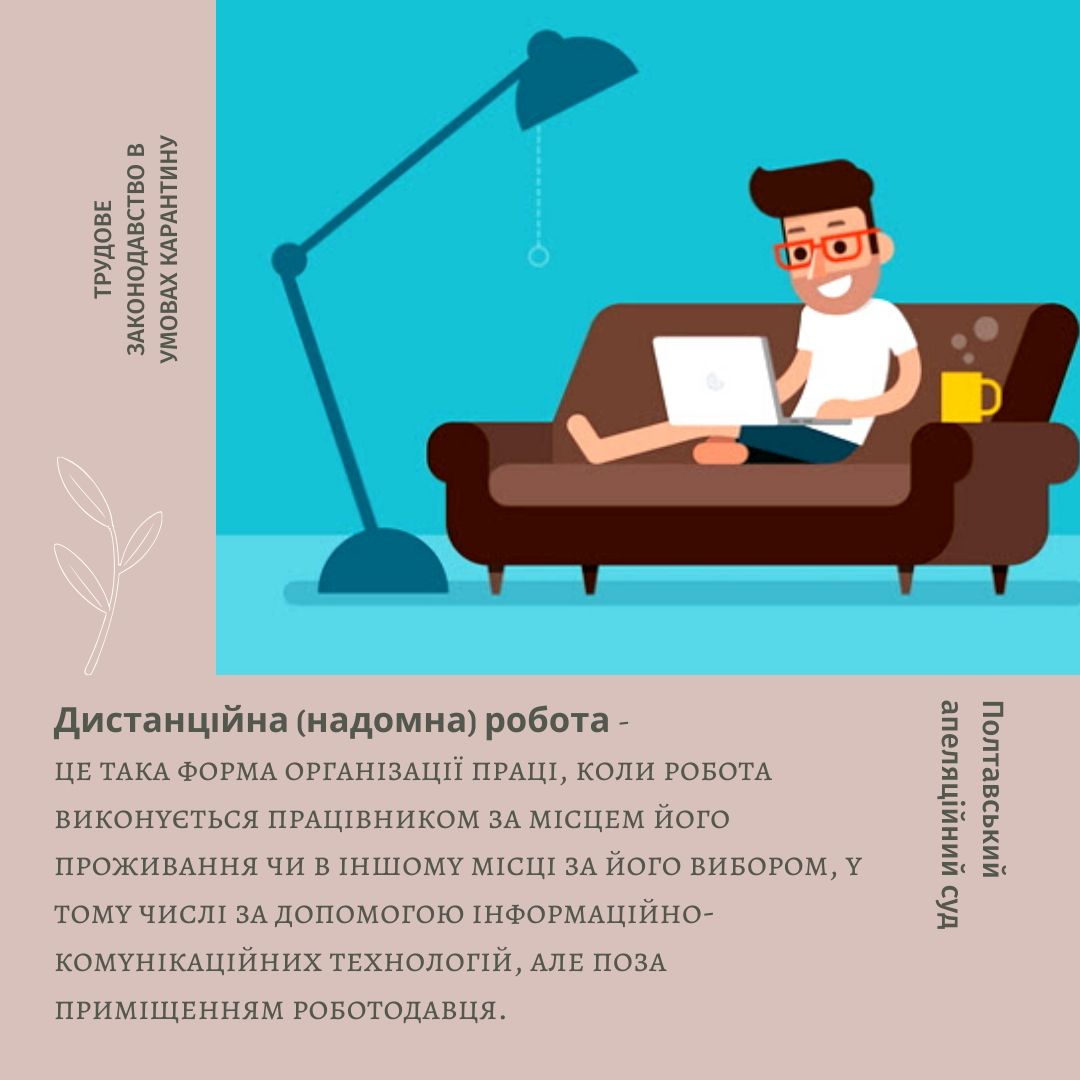 Дистанційна (надомна) робота - це така форма організації праці, коли робота виконується працівником за місцем його проживання чи в іншому місці за його вибором, у тому числі за допомогою інформаційно-комунікаційних технологій, але поза приміщенням роботодавця.