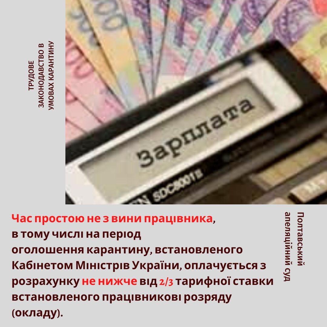 Час простою не з вини працівника, в тому числі на період оголошення карантину, встановленого Кабінетом Міністрів України, оплачується з розрахунку не нижче від двох третин тарифної ставки встановленого працівникові розряду (окладу).