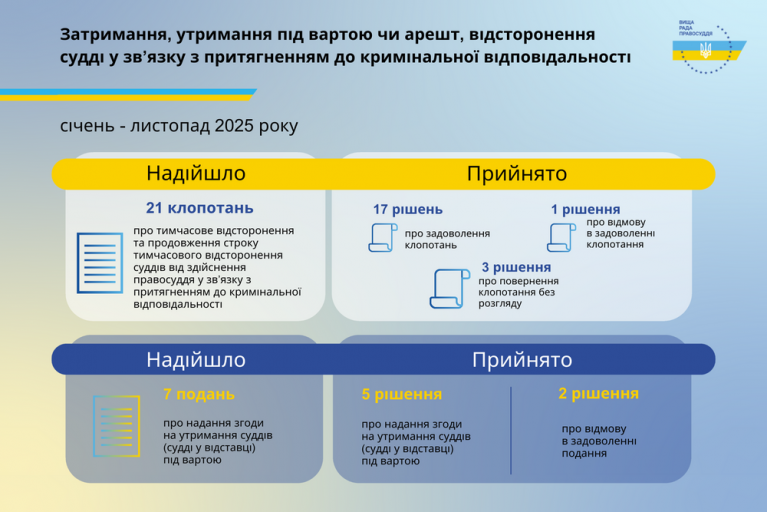 За результатами розгляду клопотань протягом січня - листопада 2025 року Вищої радою правосуддя ухвалено:
