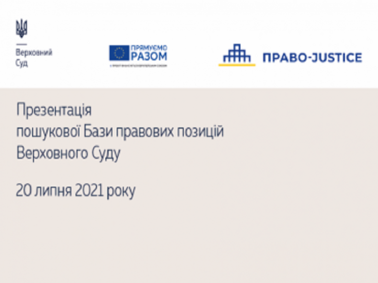 Верховний Суд за підтримки проєкту ЄС «Право-Justice» створив пошукову Базу правових позицій Верховного Суду, презентація якої відбудеться 20 липня 2021 року о 15:00 в онлайн-режимі.
