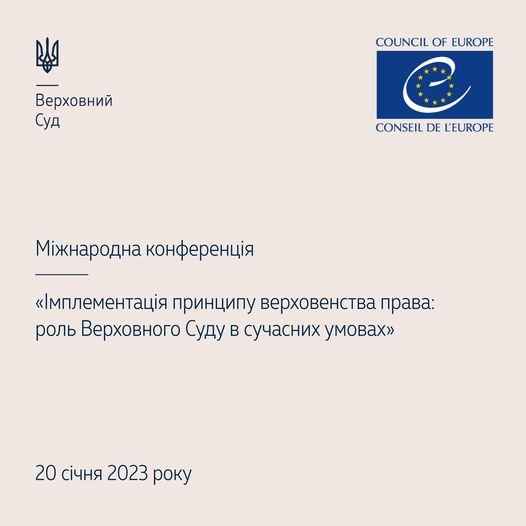 20 січня 2023 року з 10:00 до 18:00 в онлайн-форматі відбудеться міжнародна конференція «Імплементація принципу верховенства права: роль Верховного Суду в сучасних умовах», яку було перенесено у зв’язку ракетним обстрілом України 16 грудня 2022 року.