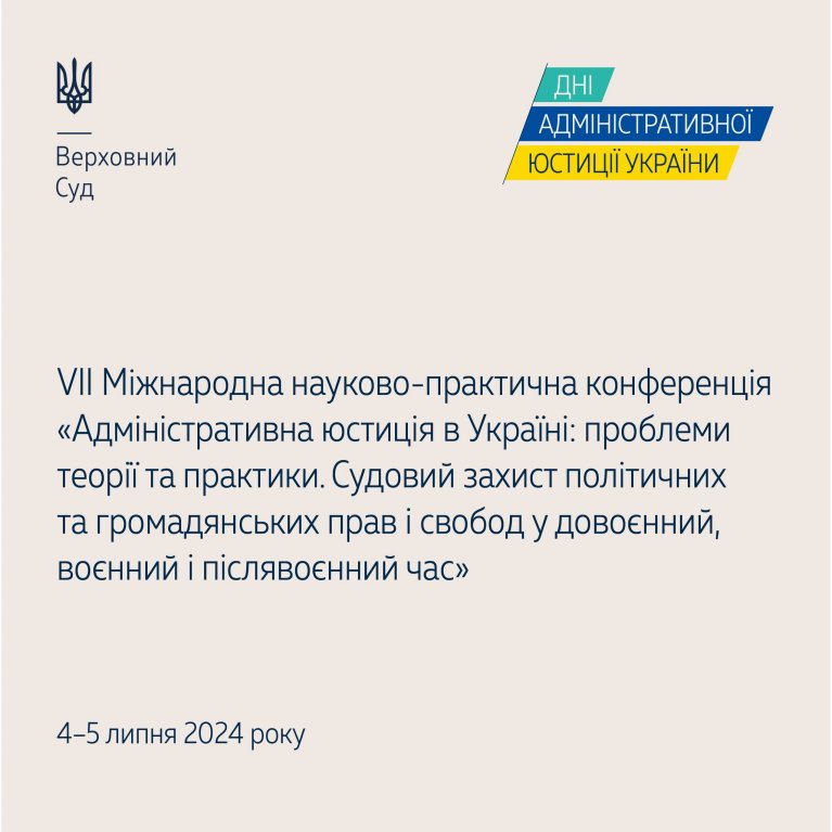 Касаційний адміністративний суд у складі Верховного Суду 4–5 липня 2024 року проводитиме VII Міжнародну науково-практичну конференцію «Адміністративна юстиція в Україні: проблеми теорії та практики. Судовий захист політичних та громадянських прав і свобод у довоєнний, воєнний і післявоєнний час».